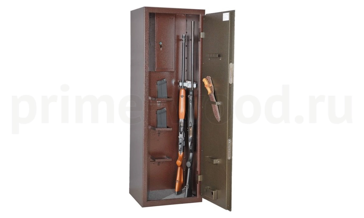 Сейф оружейный ОШ-6 на 6 стволов оснащен съемными полками и отделением под патроны. Ложементы — металлические держатели с резиновыми роликами. Максимальная высота устанавливаемого оружия — 1380 мм. Два замка.